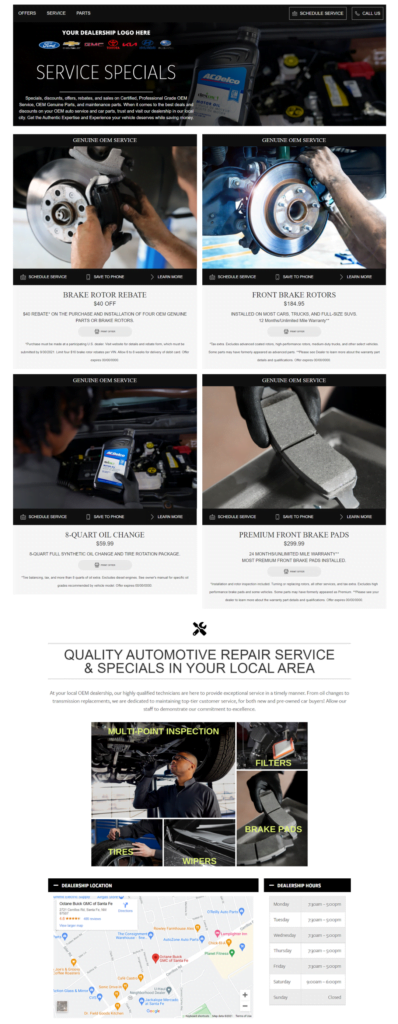 At Reach Marketing Pro, we develop custom web pages that are built within the design of your website and content management system that matches your brand’s identity, OEM, and color scheme. We always maintain compliance with OEM guidelines for co-op eligibility, so your dealership always receives your advertising dollars. During our process, we use clear, yet trackable conversion pathways and buttons that provide you with detailed insight into how many users schedule service, save coupons to their devices, and learn more about the particular services offered. Better yet, we ensure that each page clearly reiterates your dealership’s contact information and hours of operation for every website visitor.